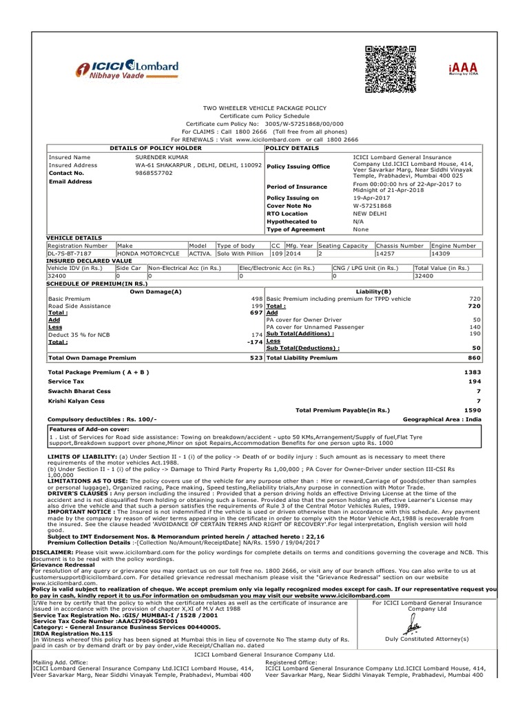 Active two wheeler insurance shields the vehicle owner from any unforeseen occurrences like the. No claim bonus on the expired policy can be availed if the insurance policy is renewed within 90 days from the date of expiration. A two wheeler insurance policy is one that helps you to cover financial expenses against any unforeseen circumstances including accidents, thefts or natural disasters, if you are an owner of a two. Buying a two wheeler insurance policy online instantly on coverfox is easy and simple, just follow the steps mentioned below: A two wheeler insurance policy should ideally be renewed before the date of its expiry.